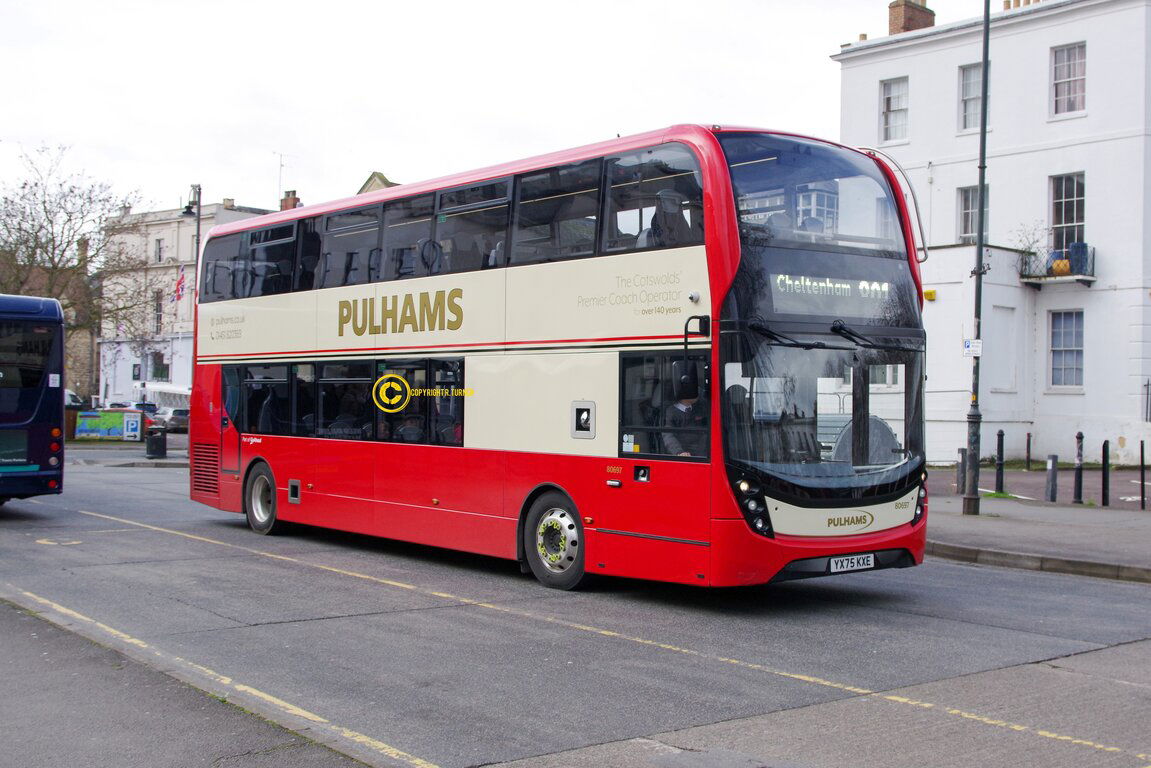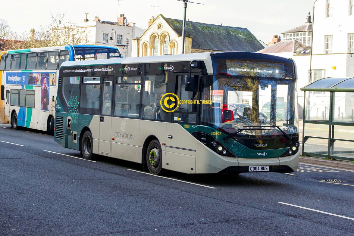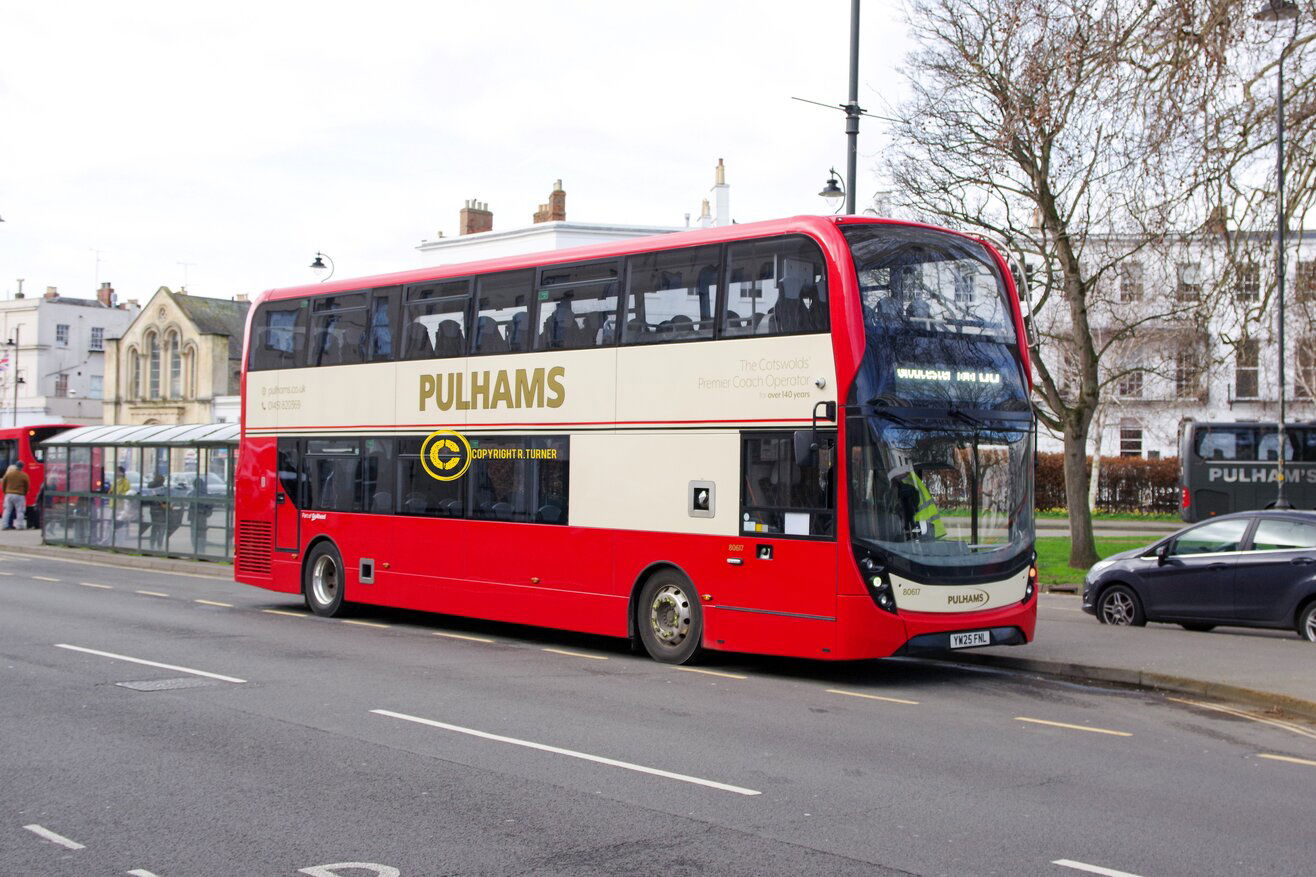 Pulhams operate a link between Tewkesbury and the new Cotswold Designer Outlet on weekends and have one the their buses painted in a dedicated livery. On weekdays the bus is used on their other services as seen in Cheltenham operating a local service. Cheltenham Town Centre - 2026.