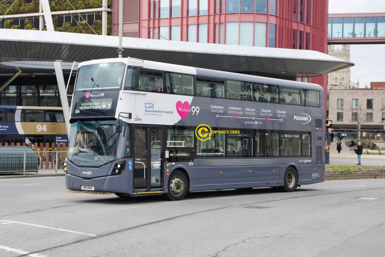 Pulhams now operate a large number of double deckers mainly for use on school and college routes, but they do venture onto certain routes. One of the older ADL Enviro 400 operated is seen at Gloucester Interchange operating the 99 between Cheltenham & Gloucester hospitals. Gloucester Interchange - 2026.