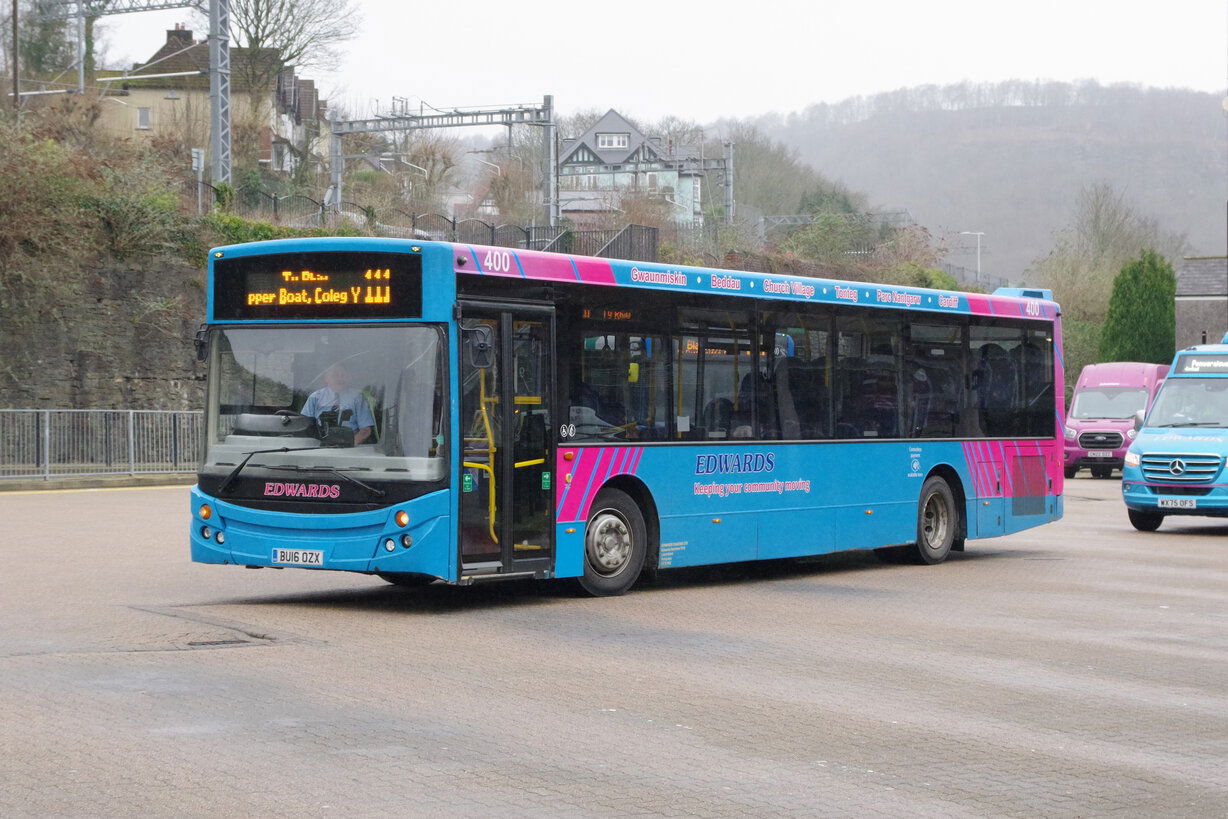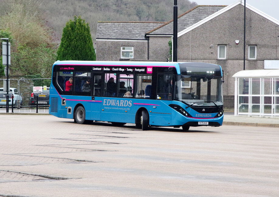 Early 2026 has seen Edwards acquire 7 new ADL Enviro 200mmc buses which are split between 1x 8.9m, 3x 9.7 & 10.m variants. The 3 9.7m variants are normally allocated to the busy route 100 between Llantrisant & Pontypridd where one is seen leaving the bus station carrying its new route branded coach livery. Pontypridd Bus Station - 2026.