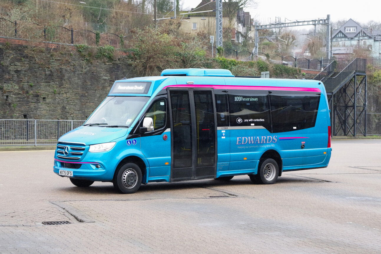 For use on tendered Pontypridd town services Edwards have recently replaced their Ilesbus bodied Iveco for a slightly larger Ilesbus bodied Mercedes-Benz Sprinter. This has also been painted into the coach style livery and is seen leaving Pontypridd Bus Station on a 109 journey. Pontypridd Bus Station - 2026.