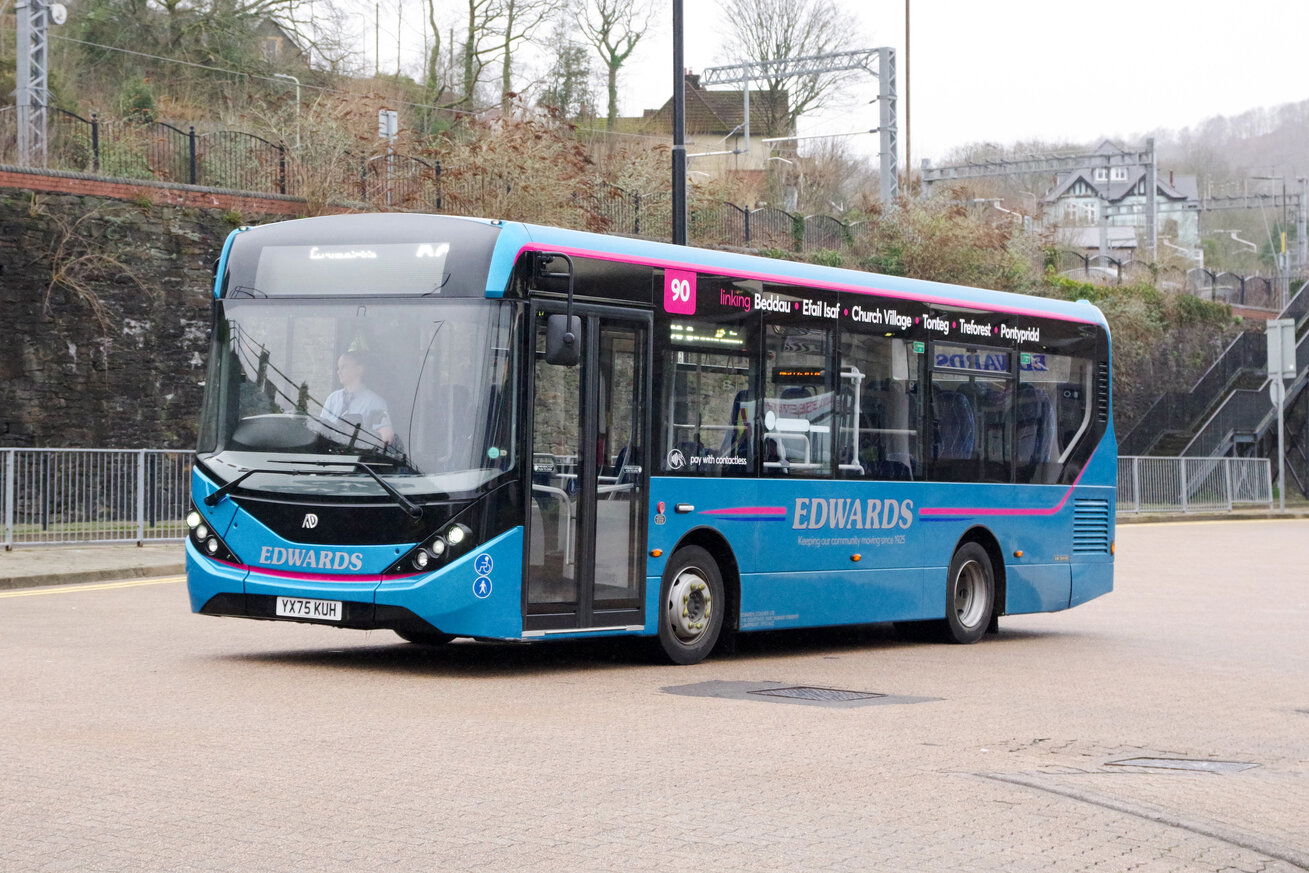Early 2026 has seen Edwards acquire 7 new ADL Enviro 200mmc buses which are split between 1x 8.9m, 3x 9.7 & 10.m variants. The smaller 8.9m variant is dedicated to route 90 Beddau to Pontypridd due to narrow roads and is seen leaving Pontypridd showing the coach livery which is also being applied to the bus fleet. Pontypridd Bus Station - 2026.