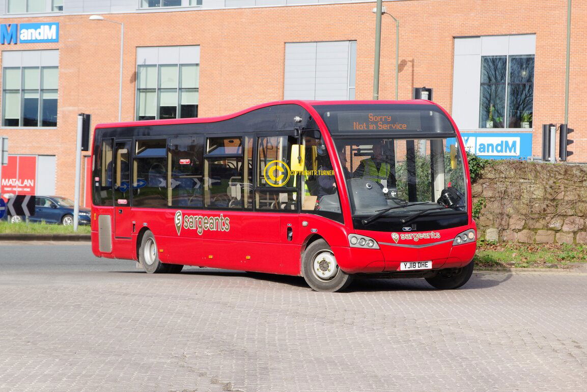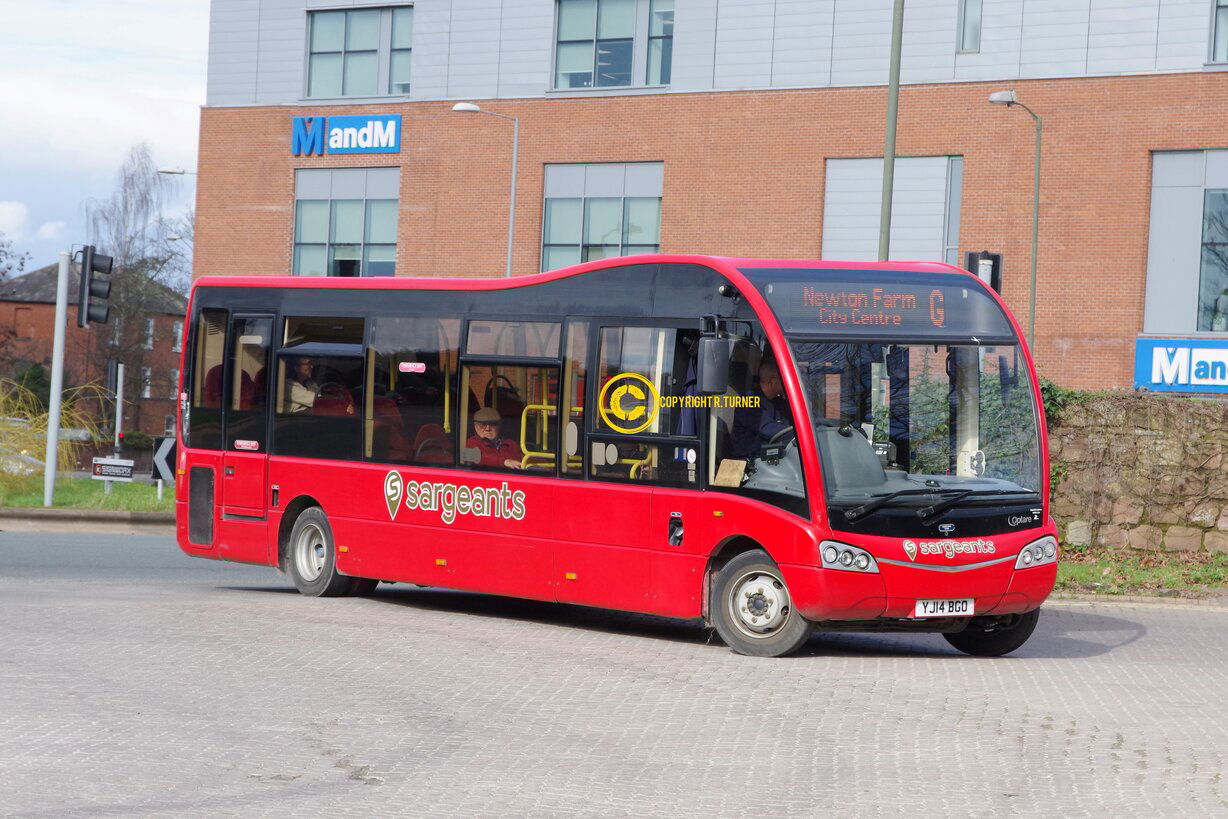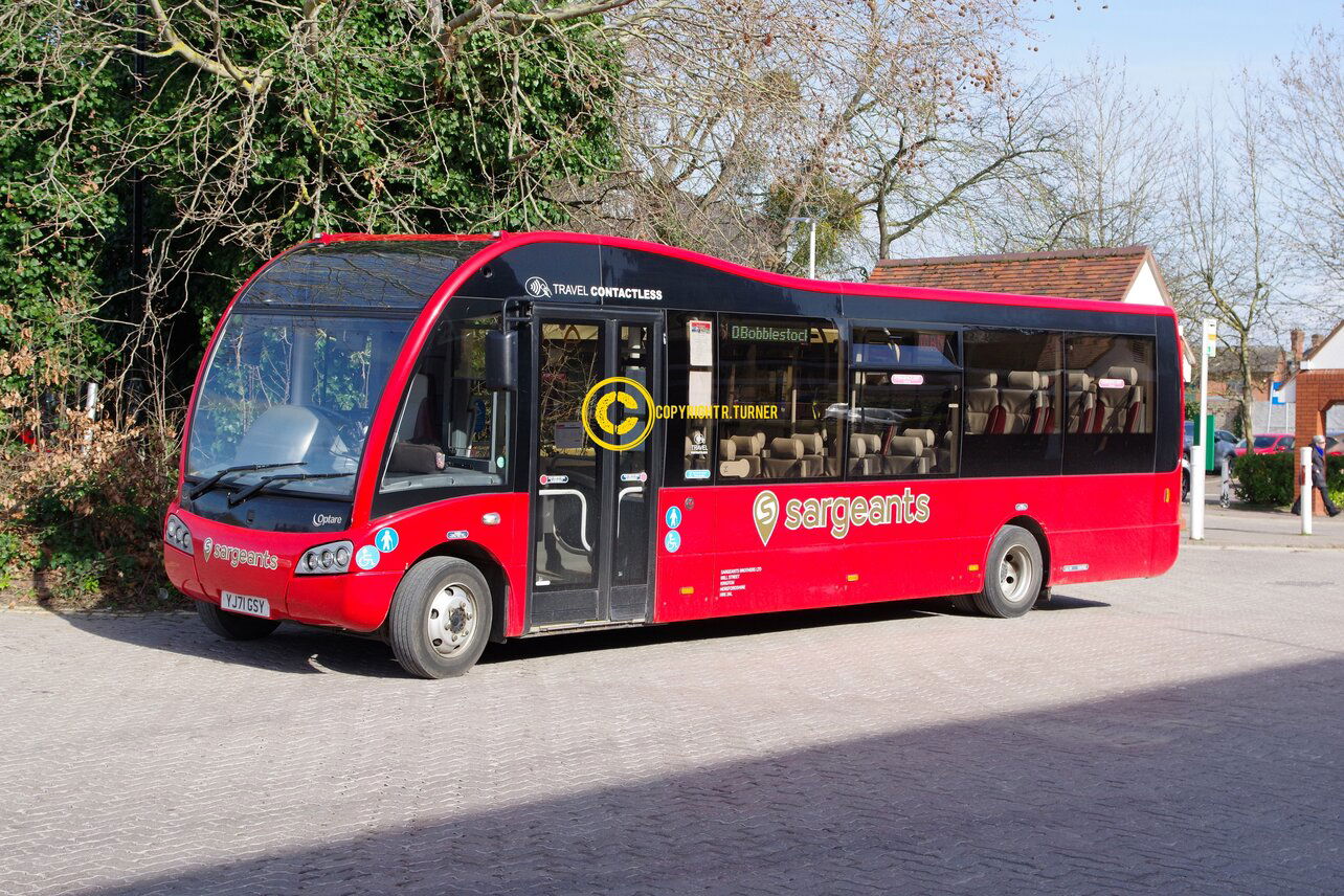 Recently Sargeants have purchased a number of modern used Optare Metrocities which has almost stanardised the fleet to Optare products. Formally operated by iGo in Birmingham one of the 1080MC models is seen parked between duties at Hereford Railway Station. Hereford Railway Station - 2020.