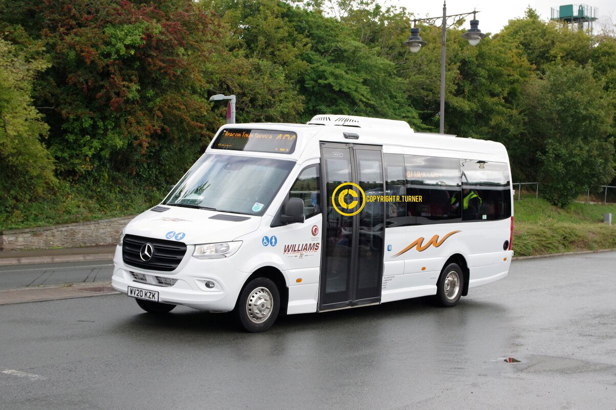 For the new bus service tenders started in September 2025 Williams have acquired 3x EVM Cityline bodied Mercedes-Benz Sprinters. These are used on the X80 from Brecon to Llandovery and the Brecon Town Services. One of the secondhand examples is seen leaving Brecon Bus Station on the Town service. Brecon Bus Station - 2025.